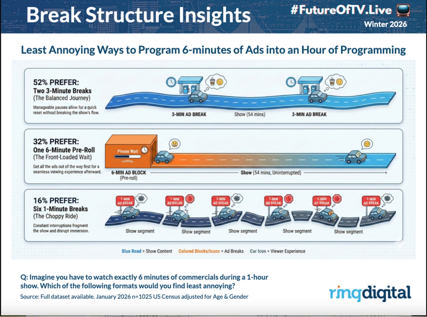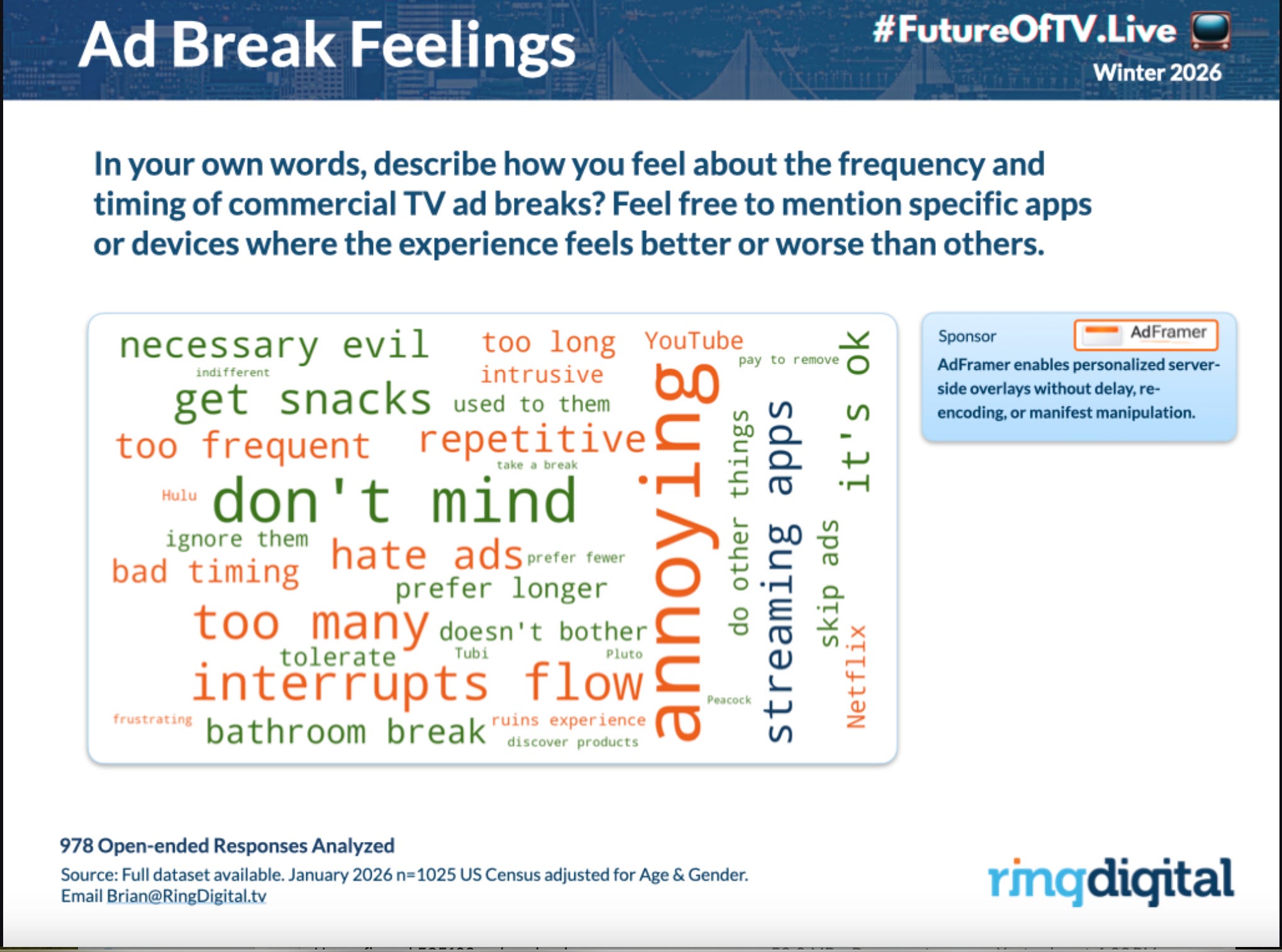 People are ok with streaming ads, and actually prefer more traditional breaks than otherwise - but they also feel that streaming ads are annoying and ruin the content flow.